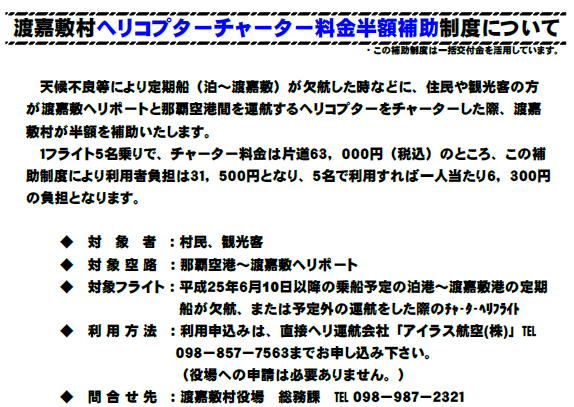 気になる料金ですが、万一船便が欠航した場合は、ヘリコプターのチャーター料金の半分を村が補助してくれる制度があります。