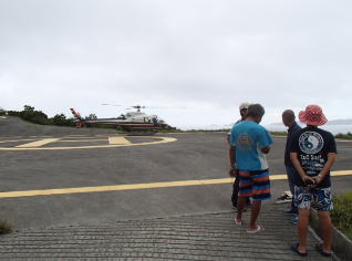 ヘリポートに着くと、そこには先ほどのヘリがしっかり着陸しており、これから乗機予定とおぼしき男性2人と、ヘリポートまで見送り来た島の方が2人がいらっしゃいます。