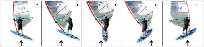 逆にジャイブのために風下に向かった場合は、セイル外側の風速が遅くなり、揚力がダウンして速度が落ちるので、バランスが取り難くなります。