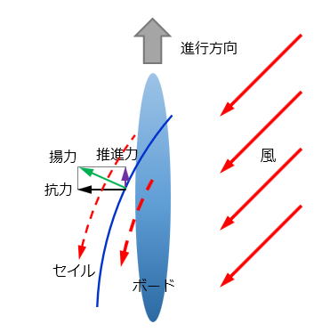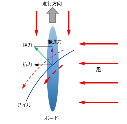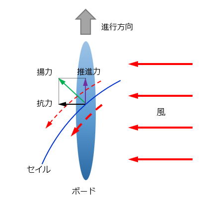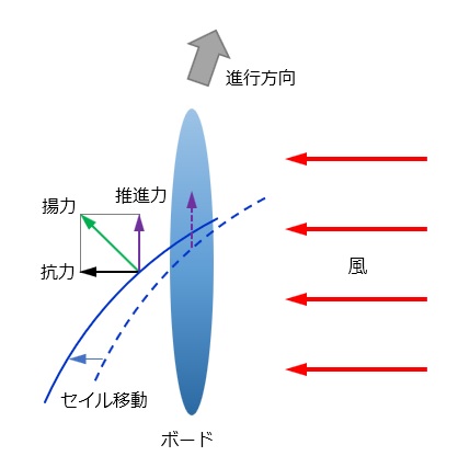 これによって、飛行機の翼と同じ様に、セイルを垂直方向に引っ張る揚力(緑色の矢印)が発生します。