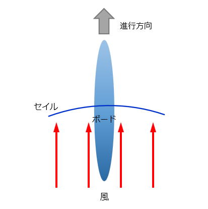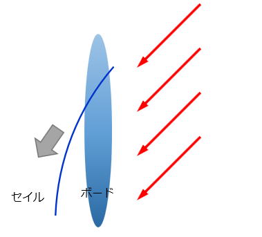 例えば下の図にあります様に、ボードを風上に向けた場合は、セイル外側の風の流れが速くなるため、揚力が瞬間的にアップして速度が増すのです。
