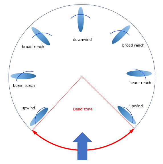 先ず、ボードの真後ろから風を受けるのをdownwind、斜め後ろから風を受けるのをbroad reach、真横から風を受けるのをbeam reach、斜め前方から風を受けるのをupwindと呼びます。