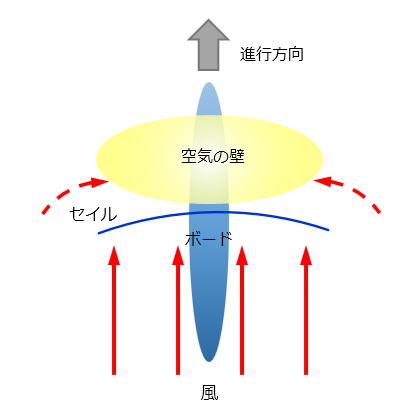 その理由は、流れていた風がセイルによって遮られる事によって、揚力どころか、却って周囲の風がセイルの両側からセイルの前に回り込んで、前面に空気の壁を作ってしまうからです。