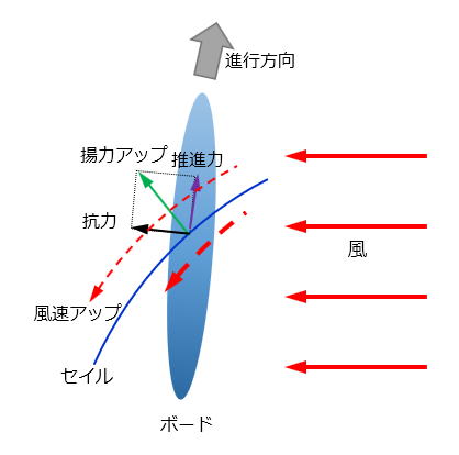 風上に向かうとセイル外側の風速が上がるので揚力もアップする