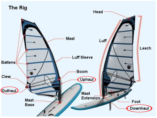 ですのでアウトホールとは、セイルを張る際外側に引っ張る部分で、ダウンホールとはセイルを下側に引っ張る部分、そしてアップホールとはセイルを待ち上げる紐の事を指します。