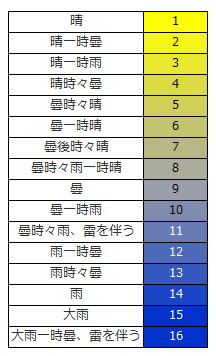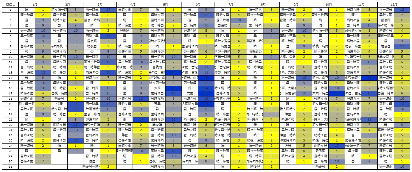 さらにこのチャートのレベル4までを晴れ、レベル5~11までを曇り、それ以上を雨で分類して集計すると以下の様になります。