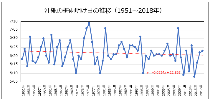 上のチャートの赤い破線(青線の傾向を示す近似曲線)をご覧の様に、沖縄の梅雨明けは(計算上)僅かながら早まっている様な感じです。